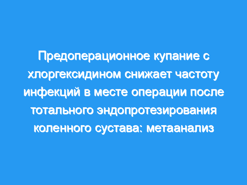 Инфекция в месте операции является разрушительным послеоперационным осложнением, и ее частота колеблется от 1% до 2% после тотального эндопротезирования коленного сустава (ТКА). Обсуждалась эффективность предоперационного применения хлоргексидина для уменьшения инфицирования. Целью данного мета-анализа было изучение эффективности применения хлоргексидина для предотвращения инфекций в местах хирургического вмешательства после ТКА.