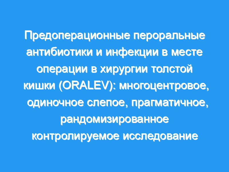 В этом многоцентровом, прагматичном, рандомизированном контролируемом исследовании (ORALEV) пациенты, перенесшие операцию на толстой кишке, были набраны из пяти крупных больниц Испании, в которых приняли участие 47 колоректальных хирургов в этих больницах. Пациенты имели право на включение, если у них была диагностирована неоплазия или дивертикулярная болезнь и если была показана частичная резекция толстой кишки или полная колэктомия. Участники были рандомизированы (1:1) с использованием онлайн-таблиц рандомизации либо на прием пероральных антибиотиков за день до операции (экспериментальная группа), либо на отсутствие приема пероральных антибиотиков перед операцией (контрольная группа). В экспериментальной группе ципрофлоксацин в дозе 750 мг вводили каждые 12 ч (две дозы через 1200 ч и 0000 ч) и метронидазол в дозе 250 мг каждые 8 ч (три дозы через 1200 ч, 1800 ч и 0000 ч) за день до операции. Всем пациентам вводили внутривенно цефуроксим 1·5 г и метронидазол 1 г во время введения анестезии. Первичным исходом была частота инфекций в месте операции. Пациенты находились под наблюдением в течение 1 месяца после операции, и все послеоперационные осложнения были зарегистрированы. Это исследование было зарегистрировано в EudraCT, 2014-002345-21, и ClinicalTrials.gov , NCT02505581, и закрыт для начисления. Выводы: В период со 2 мая 2015 года по 15 апреля 2017 года мы оценили 582 пациента на предмет соответствия критериям, из которых 565 были допущены к лечению и рандомизированы для получения либо без пероральных антибиотиков (n=282), либо пероральных антибиотиков (n=282) до операции. 13 участников в контрольной группе и 16 в экспериментальной группе были впоследствии исключены, 269 участников в контрольной группе и 267 в экспериментальной группе получили назначенное им вмешательство. Частота инфекций в месте хирургического вмешательства в контрольной группе (30 [11%] из 269) была значительно выше, чем в экспериментальной группе (13 [5%] из 267, тест22 p=0·013). Пероральные антибиотики были связаны со значительным снижением риска инфекций в месте операции по сравнению с отсутствием пероральных антибиотиков (отношение шансов 0·41, 95% ДИ 0·20-0·80 , p=0·008). В контрольной группе наблюдалось больше осложнений (включая инфекции в месте операции), чем в экспериментальной группе (76 [28%] против 51 [19%], p=0·017), хотя не было различий в тяжести, оцениваемых по шкале Клавьена-Диндо. Не было отмечено различий между группами в отношении местных осложнений, хирургических осложнений или медицинских осложнений, которые не были связаны с септическими осложнениями. Интерпретация: Пероральный прием антибиотиков в качестве профилактики за день до операции на толстой кишке значительно снижает частоту инфекций в месте операции без механической подготовки кишечника и должен регулярно применяться перед плановой операцией на толстой кишке. Финансирование: Фонд Испанской ассоциации колопроктологии.