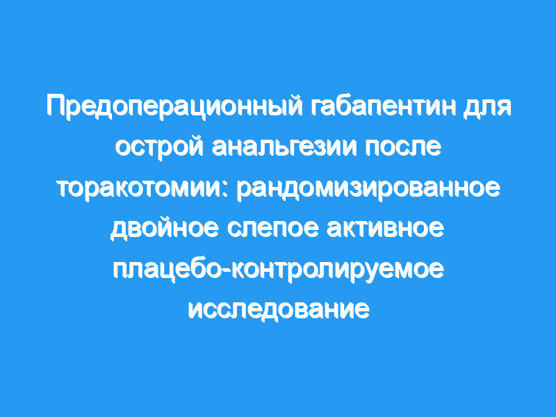 Роль предоперационного габапентина в послеоперационном обезболивании неясна, особенно у пациентов, получающих регионарную блокаду. Пациенты, перенесшие торакотомию, получают пользу от эпидуральной анальгезии, но все же могут испытывать значительную послеоперационную боль. Мы изучили эффект предоперационного приема габапентина у пациентов, перенесших торакотомию.