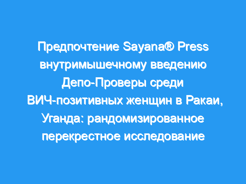Sayana Press (SP), подкожная форма депо медроксипрогестерона ацетата (DMPA), предварительно заполненная в системе инъекций Uniject, потенциально может улучшить и расширить услуги по инъекциям контрацептивов, но приемлемость SP неизвестна. ВИЧ-инфицированные женщины нуждаются в контрацепции, чтобы избежать нежелательной беременности и риска вертикальной передачи ВИЧ. Мы оценили приемлемость SP по сравнению с внутримышечным введением DMPA (DMPA-IM) среди ВИЧ-позитивных женщин и их лечащих врачей в Ракаи, Уганда.