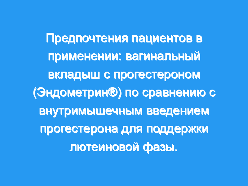 Введение экзогенного прогестерона для поддержки лютеиновой фазы стало стандартом практики. Внутримышечные (внутримышечные) инъекции прогестерона в масле (PIO) и вагинальное введение прогестерона являются основными путями введения. В этом отчете описаны предпочтения в применении, выраженные женщинами с бесплодием, которым вводили прогестероновую вагинальную вставку (PVI) или прогестерон в масляных инъекциях (PIO) для поддержки лютеиновой фазы во время новых циклов ЭКО.