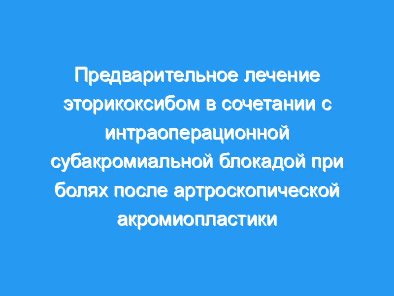 Артроскопическая операция на плече под общим наркозом часто сопровождается сильной послеоперационной болью, которая может задержать выписку и начало реабилитации. Эторикоксиб — это новый ингибитор циклооксигеназы-2 с длительным действием и отсутствием ухудшающего влияния на функцию тромбоцитов. Таким образом, влияние предоперационного эторикоксиба в сочетании с местной анестезией на послеоперационную боль и профиль выделений было изучено у пациентов дневной хирургии, перенесших артроскопическую операцию на плече под общей анестезией.