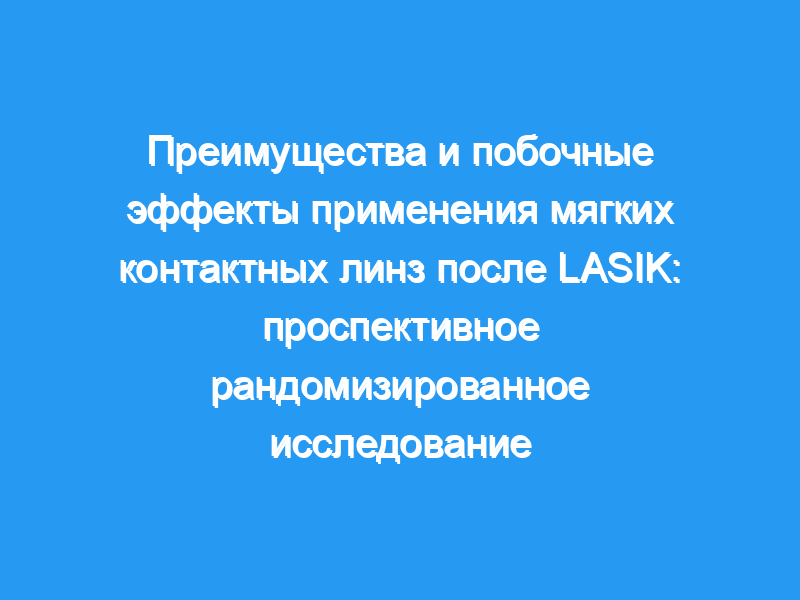 Оценить преимущества и побочные эффекты установки мягких контактных линз с повязкой (BSCL) после LASIK в зависимости от характеристик пациентов. Дизайн: Проспективное, рандомизированное, двухцентровое сравнительное исследовательское исследование. Участники: Сто пациентов (200 глаз) с близорукостью и/или близоруким астигматизмом.
