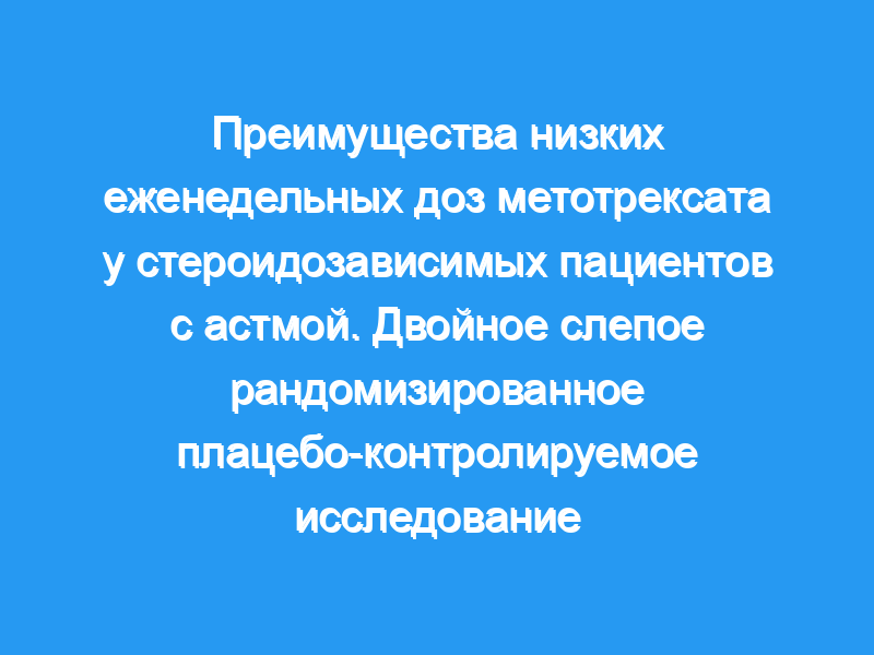 Несмотря на то, что было протестировано несколько препаратов, выбор идеального стероидосберегающего средства у стероидозависимых пациентов с астмой остается неясным. Наша цель состояла в том, чтобы оценить эффективность и переносимость метотрексата в низких еженедельных дозах с целью снижения хронической потребности в пероральных стероидах у пациентов с астмой. Дизайн: двойное слепое рандомизированное плацебо-контролируемое исследование.