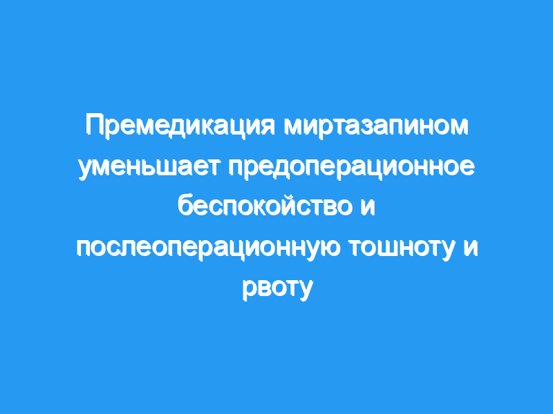 Миртазапин — это новый антидепрессант, который блокирует рецепторы 5-НТ2 и 5-НТ3. С таким профилем рецепторов возможно, что миртазапин может обеспечить как анксиолиз, так и эффективность при послеоперационной тошноте и рвоте (PONV). Поэтому мы проверили гипотезу о том, что премедикация миртазапином может снизить предоперационную тревогу и PONV.