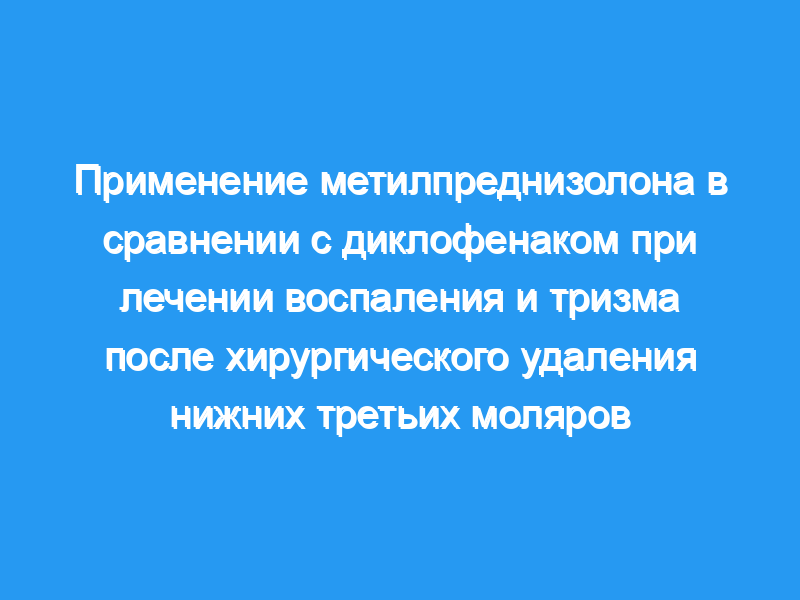 Сравнить эффективность метилпреднизолона (кортикоида) и диклофенака (нестероидного противовоспалительного средства — НПВП) при лечении воспаления и тризма после хирургического удаления нижних третьих моляров. План исследования: Проспективное исследование 73 пациентов с хирургическим удалением нижних третьих моляров. Эти пациенты были случайным образом разделены на две группы: группу диклофенака и группу метилпреднизолона. Была заполнена регистрационная карточка с предоперационными и послеоперационными эпидемиологическими и клиническими данными о воспалении и тризме (три измерения лица и открытие рта). Для того, чтобы провести широкое изучение данных, для статистики была использована программа BMDP.