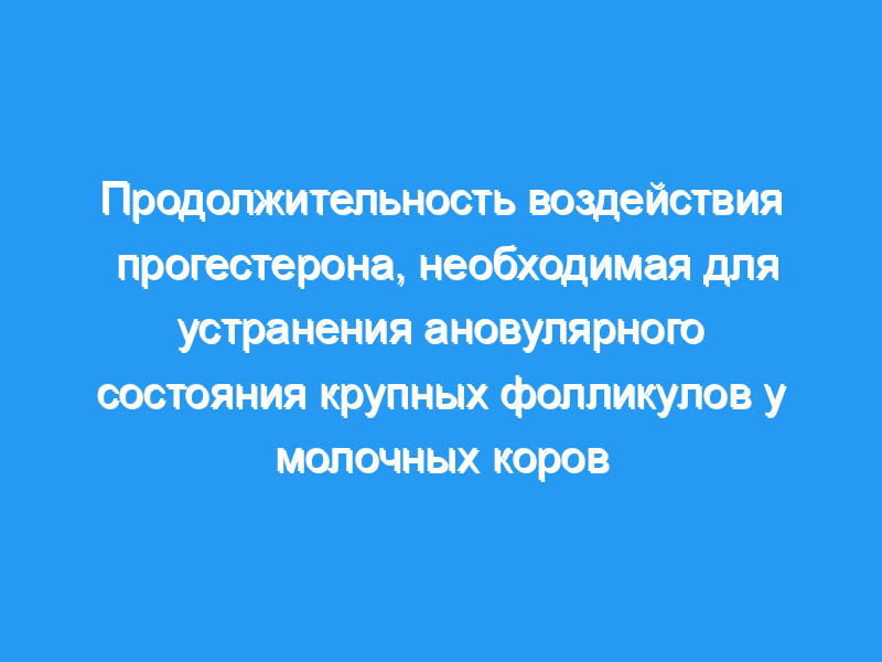 Ановулярных коров (n = 16) распределили в одну из четырех групп лечения (0, 1, 3 или 7 дней лечения прогестероном) с использованием интравагинального имплантата, высвобождающего прогестерон (CIDR). У всех ановулярных коров были низкие концентрации циркулирующего прогестерона до контролируемого внутреннего высвобождения препарата (CIDR) и более высокие концентрации, которые достигли устойчивого состояния (1.3 +/- 0.1 нг/мл прогестерона) через 3 ч после введения CIDR.