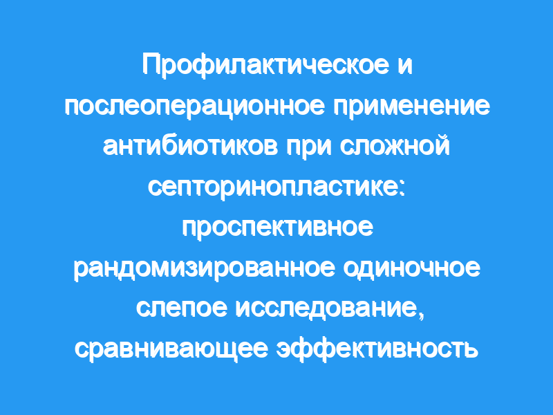 Сравнить эффективность профилактического и послеоперационного применения антибиотиков при комплексной септоринопластике и укрепить доказательную базу для применения антибиотиков в хирургии носа. Дизайн: Рандомизированное, проспективное, одиночное слепое исследование. Сто шестьдесят четыре пациента, нуждающихся в сложной операции септоринопластики, были последовательно отобраны из списков ожидания 2 старших авторов. Мощность была рассчитана на уровне 80% при уровне значимости 5%. Пациенты, рандомизированные в профилактическую группу исследования, получали три внутривенные дозы амоксициллина-клавуланата по 1200 мг, вводимые при введении анестезии и через 6 и 12 часов после операции. Пациенты в послеоперационном отделении, получавшие антибиотики, получали 7-дневный курс амоксициллина-клавуланата по 375 мг 3 раза в день. Пациентам с аллергией на пенициллин давали эритромицин. Клинические и микробиологические признаки инфекции на 10-й день после операции были классифицированы как незначительные (вестибулит) или серьезные (целлюлит носа или перегородки, абсцесс перегородки, вторичное кровотечение или инфекция донорского участка) инфекции.