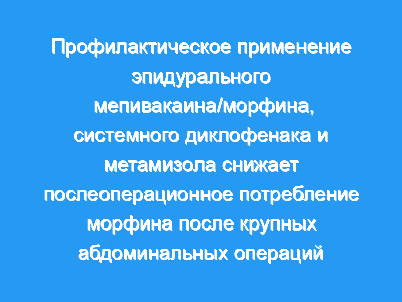 Сто сорок два пациента, которым была запланирована крупная абдоминальная операция, были случайным образом распределены в одну из трех групп и проспективно изучены. Эпидуральные катетеры в группах 1 и 2 были установлены в промежутках T8-T10, положение катетера было подтверждено эпидурографией и сенсорным тестированием после введения 5 мл 1% мепивакаина. Группа 1 получала 75 мг диклофенака внутримышечно, 1000 мг метамизола внутривенно, 5.3 +/- 1 мг эпидурального морфина и 15-20 мл мепивакаина 1% 85 +/- 41 за минуту до надреза кожи. Эпидуральную анальгезию поддерживали инъекциями 0,1 мл.кг-1 ч.1 мепивакаина 1%. Пациенты 2-й группы получали сбалансированный режим обезболивания перед закрытием раны (221 +/- 86 мин после разреза кожи). Пациенты 3-й группы не получали никаких исследуемых веществ. Общую анестезию вводили 5 мг/кг тиопентала и 2 мкг/кг фентанила и поддерживали энфлураном и закисью азота. Послеоперационная анальгезия состояла из контролируемого пациентом внутривенного введения морфина в течение 5 дней.
