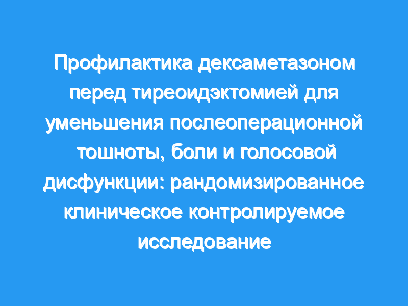 Целью этого двухэтапного двойного слепого рандомизированного контролируемого исследования было оценить влияние предоперационной однократной дозы стероида на послеоперационную тошноту и рвоту (PONV), боль и голосовую функцию после тиреоидэктомии по поводу доброкачественного заболевания.