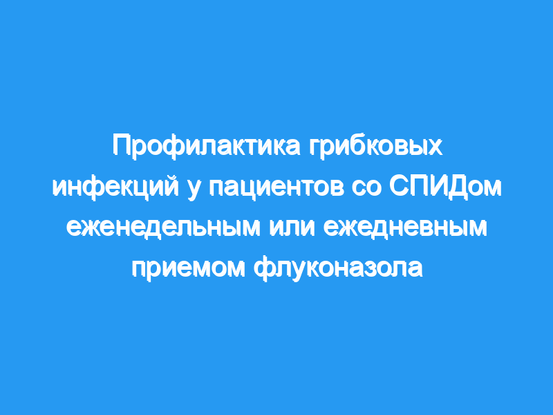 Мы сравнили эффективность флуконазола в дозе 400 мг один раз в неделю по сравнению с суточной дозой 200 мг для профилактики глубоких грибковых инфекций в многоцентровом рандомизированном двойном слепом исследовании с участием 636 пациентов, инфицированных вирусом иммунодефицита человека, чтобы определить, может ли менее интенсивный режим приема флуконазола предотвратить эти серьезные, но относительно редкие осложнения СПИДа. В анализе «намерение лечить» глубокая грибковая инфекция развилась у 17 пациентов (5,5%), рандомизированных на ежедневное лечение флуконазолом, и у 24 (7,7%), получавших флуконазол еженедельно в течение 74 недель наблюдения (разница в риске 2,2%, 95% доверительный интервал [ДИ] -1,7% до 6,1%). Молочница встречалась в два раза чаще у пациентов, получавших флуконазол еженедельно по сравнению с ежедневным приемом (отношение рисков 0,59, 95% ДИ 0,40-0,89), а в подгруппе обследованных пациентов резистентность к флуконазолу встречалась редко.
