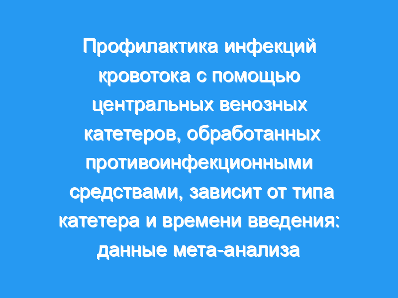 Чтобы проверить доказательства того, что риск инфекции, связанный с центральными венозными катетерами (ЦВК), снижается за счет противоинфекционного покрытия или манжеты. Дизайн: Систематический обзор рандомизированных контролируемых исследований, сравнивающих противоинфекционные и неактивные (контрольные) CVC. Вмешательства: Среднее время введения было взято в качестве измерения продолжительности введения. Дихотомические данные были объединены с использованием модели с фиксированным эффектом и выражены в виде отношения шансов (OR) с 95% доверительным интервалом (CI95).