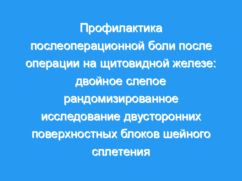 Мы провели двойное слепое рандомизированное плацебо-контролируемое исследование для оценки обезболивающей эффективности двусторонних поверхностных блокад шейного сплетения, выполненных в конце операции.Девяносто пациентов, перенесших плановую операцию на щитовидной железе одним и тем же хирургом под общим наркозом, были рандомизированы для получения 20 мл изотонического раствора хлорида натрия или 20 мл бупивакаина 0,25% с 1:200 000 адреналина.
