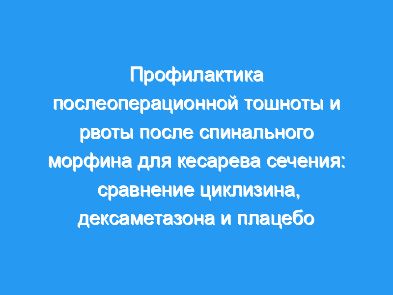 Мы пришли к выводу, что после обезболивания спинальным морфином в дозе 0,2 мг и фентанилом в дозе 10 мкг при кесаревом сечении циклизин в дозе 50 мг внутривенно снижает частоту тошноты по сравнению с дексаметазоном в дозе 8 мг внутривенно или плацебо. Это также уменьшает тяжесть тошноты и рвоты и повышает удовлетворенность матери в раннем послеоперационном периоде.