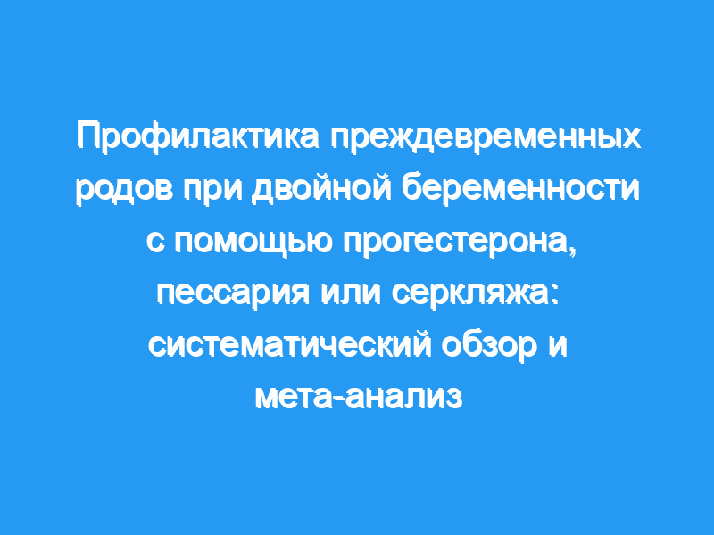 Оценить доказательства эффективности прогестерона, серклага и пессария при беременности двойней. Стратегия поиска: Мы искали Medline, EMBASE, CINAHL, Cochrane Central Register of Controlled Trials и ISI Web of Science без языковых ограничений до 25 января 2016 года. Критерии отбора: Рандомизированные контролируемые испытания прогестерона, серклага или пессария для предотвращения преждевременных родов у женщин с двойной беременностью без симптомов угрозы преждевременных родов. Сбор и анализ данных: Два независимых эксперта извлекли данные с помощью экспериментальной формы. Качество исследования оценивалось с помощью кокрановского инструмента оценки риска предвзятости. Мы провели попарный обратный дисперсионный мета-анализ случайных эффектов.