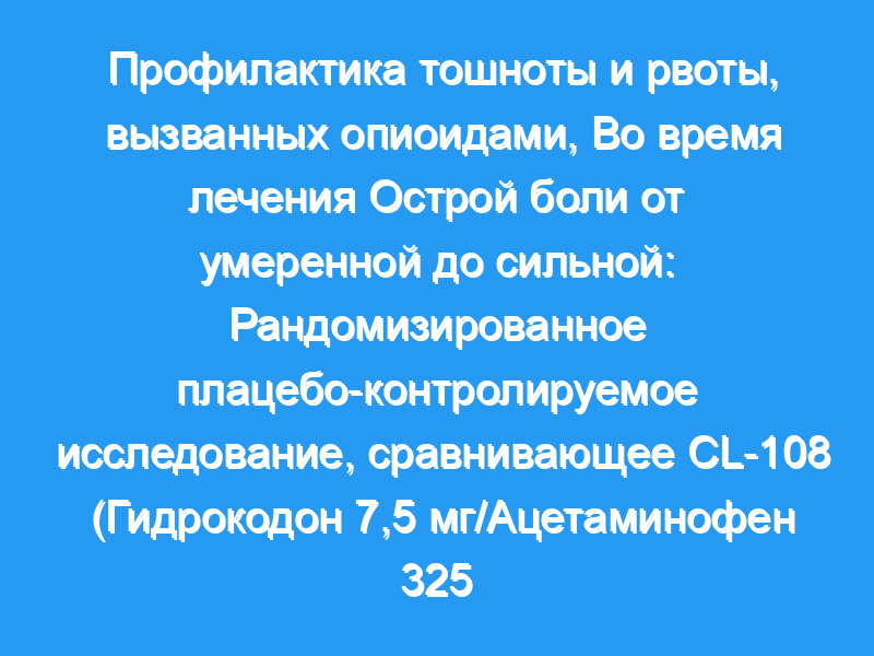 Оценить профилактику тошноты и рвоты, вызванных опиоидами (OINV), и облегчение острой боли от умеренной до сильной с помощью CL-108, нового препарата, сочетающего низкие дозы противорвотного средства (прометазин быстрого высвобождения 12,5 мг) с гидрокодоном 7,5 мг/ацетаминофен 325 мг (HC/APAP) был использован.