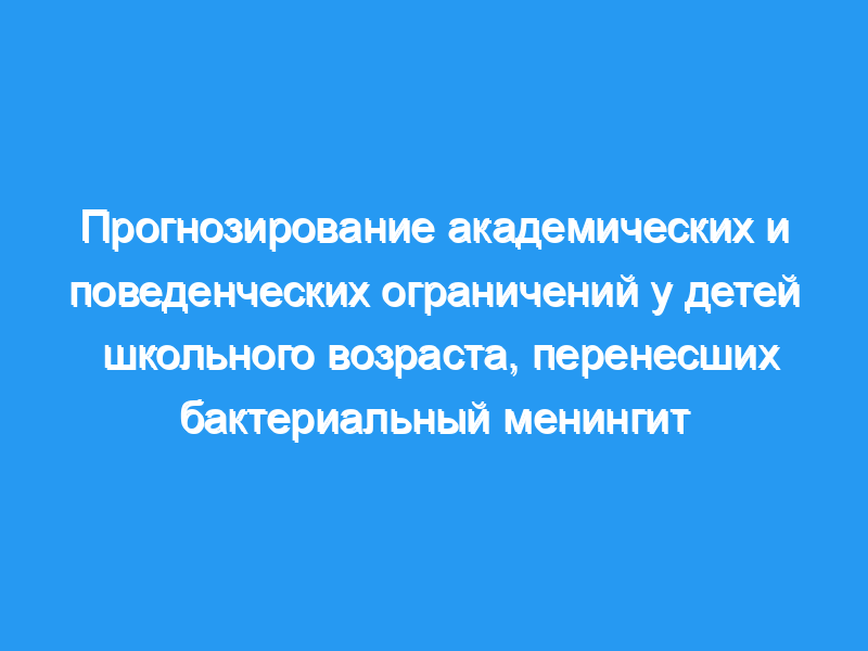 Совокупная частота академических и/или поведенческих ограничений среди детей, переживших бактериальный менингит без тяжелых последствий заболевания, составила 32%. Правило прогнозирования основывалось на девяти независимых факторах риска: пол, вес при рождении, уровень образования отца, S. pneumoniae, количество лейкоцитов в спинномозговой жидкости, задержка между приемом и началом приема антибиотиков, использование дексаметазона, судороги, леченные противосудорожной терапией, и длительная лихорадка. Когда 10 было взято в качестве точки отсечения для оценки риска, рассчитанной с использованием этого правила, можно было идентифицировать 76% детей с ограничениями, в то время как 38% детей в когорте были отобраны как подверженные риску этих ограничений.