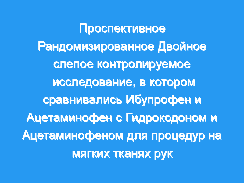 В это проспективное рандомизированное двойное слепое контролируемое исследование были включены пациенты, перенесшие плановые процедуры на мягких тканях кисти (освобождение запястного канала, освобождение спускового пальца, освобождение первого дорсального отсека или удаление кисты ганглия). Пациенты были рандомизированы до операции на 2 группы лечения: ацетаминофен / гидрокодон 325/5 мг (АГ, группа опиоидов) или ацетаминофен /ибупрофен 500/400 мг (AIBU, неопиоидная группа) и наблюдались в течение 2 недель после операции, оценивая ежедневные показатели интенсивности боли — визуальная аналоговая шкала (ВАШ), медикаментозное обезболивание (облегчение боли Лайкерта оценка), необходимость назначения спасательных опиоидов в течение 1 недели и дней до полного избавления от боли.
