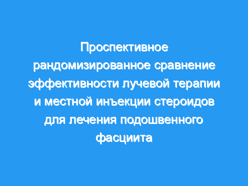 Целью этого исследования было провести рандомизированное исследование лучевой терапии подошвенного фасцита и сравнить лучевую терапию с местными инъекциями стероидов. Методы и материалы: В период с марта 2013 по апрель 2014 года 128 пациентов с подошвенным фасциитом были рандомизированы для получения лучевой терапии (общая доза 6,0 Гр, применяемая в 6 фракциях по 1,0 Гр три раза в неделю) или местных инъекций кортикостероидов. Инъекция 40 мг метилпреднизолона в 1 мл и 0,5 мл 1% лидокаина под кожу. руководство пальпацией. Результаты были измерены с использованием визуальной аналоговой шкалы, модифицированной шкалы фон Панневица и 5-уровневой оценки функций. Основная фаза исследования составляла 3 месяца, с периодом наблюдения до 6 месяцев.