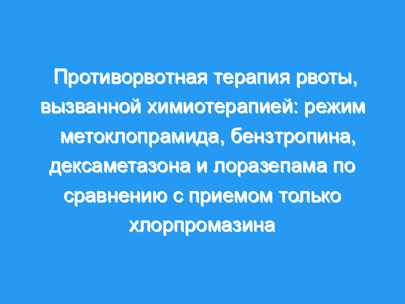 Двадцать шесть детей в возрасте от 4 до 15 лет, которым предстояло пройти химиотерапию рака, были включены в двойное слепое рандомизированное перекрестное исследование, в котором сравнивалась противорвотная эффективность схемы из четырех препаратов (схема MBDL: метоклопрамид, 8 мг/кг, бензтропин, 0,04 мг/кг, дексаметазон, 0,7 мг/кг, лоразепам, 0,1 мг/кг), вводимый в течение 24 часов, с эффективностью хлорпромазина, 3,3 мг/кг, вводимого в четырех дозах в течение 24 часов.