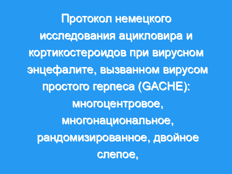 Лечение энцефалита, вызванного вирусом простого герпеса (ВПГ), остается серьезной нерешенной проблемой в неврологии. В настоящее время золотым стандартом терапии является ацикловир, препарат, который подавляет репликацию вируса. Несмотря на противовирусное лечение, смертность по-прежнему составляет до 15%, менее 20% пациентов могут вернуться к работе, а большинство пациентов страдают от тяжелой инвалидности. Это обескураживающая, неудовлетворительная ситуация для лечащих врачей, пациентов-инвалидов и их семей и представляет собой огромное бремя для служб общественного здравоохранения. Информация, полученная в результате экспериментальных исследований на животных и недавних ретроспективных клинических наблюдений, указывает на то, что у пациентов с ВПГ, получающих адъювантный дексаметазон, можно ожидать существенного улучшения результатов. Но в настоящее время нет доступных доказательств, подтверждающих рутинное применение адъювантного лечения кортикостероидами при ВПГ. Рандомизированное многоцентровое исследование является единственным полезным инструментом для решения этого вопроса. Дизайн: GACHE — это многоцентровое рандомизированное двойное слепое плацебо-контролируемое параллельное групповое клиническое исследование лечения ацикловиром и адъювантом дексаметазоном по сравнению с ацикловиром и плацебо у взрослых с ВПГ. Статистический дизайн будет представлять собой 3-этапное групповое последовательное исследование с возможной адаптацией размера выборки на последнем этапе.