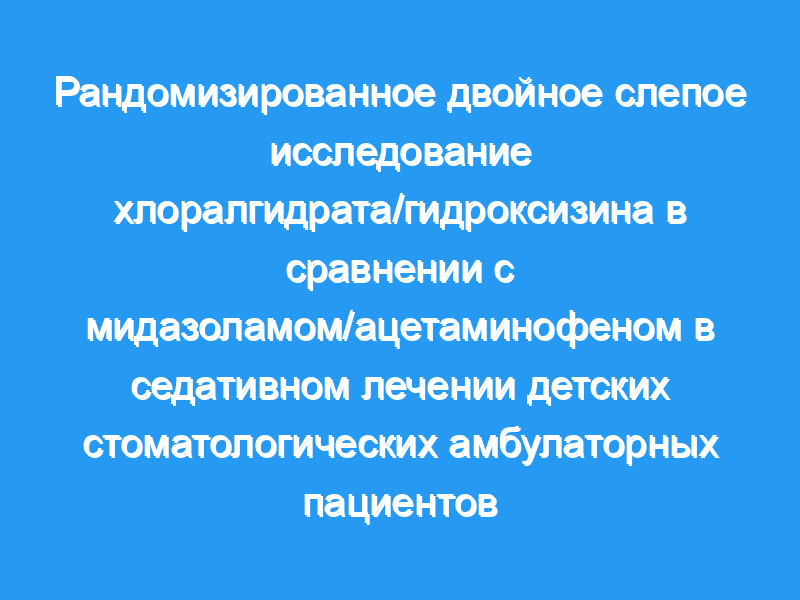 Целью этого исследования было оценить рандомизированным двойным слепым способом седативные и поведенческие реакции детей, проходящих амбулаторные стоматологические процедуры в педиатрии и получавших комбинацию либо перорального хлоралгидрата 50 мг/кг, не более 1 г, с гидроксизином 25 мг (группа 1), или пероральный мидазолам 0,5 мг/кг с эликсиром ацетаминофена 10 мг/кг (группа 2). Дети были оценены в соответствии со сном, движением, плачем и общим поведением с заранее выбранными интервалами, которые включали предварительную подготовку, введение в операционную, инъекцию и общее поведение.