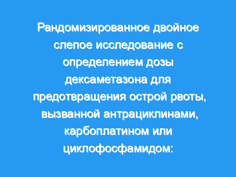 Различные дозы и схемы приема дексаметазона в сочетании с антагонистом 5-НТ3 используются для предотвращения острой рвоты, вызванной антрациклинами, карбоплатином или циклофосфамидом. Поэтому мы запланировали рандомизированное двойное слепое исследование по определению дозы, направленное на определение предпочтительной дозы и схемы приема дексаметазона. Пациенты и методы: Все последовательные пациенты, не получавшие химиотерапию, включенные в исследование, были рандомизированы для получения для профилактики острой рвоты в течение первых 24 часов одного из следующих режимов приема дексаметазона в комбинации с ондансетроном в дозе 8 мг внутривенно (внутривенно): для руки А — 8 мг внутривенно.v. перед химиотерапией плюс 4 мг перорально каждые 6 часов в течение четырех доз, начиная в одно и то же время химиотерапии, для руки В — 24 мг внутривенно разовая доза перед химиотерапией, а для руки С — 8 мг внутривенно разовая доза перед химиотерапией. Все пациенты получали со 2 по 5 день пероральный дексаметазон в дозе 4 мг внутривенно.
