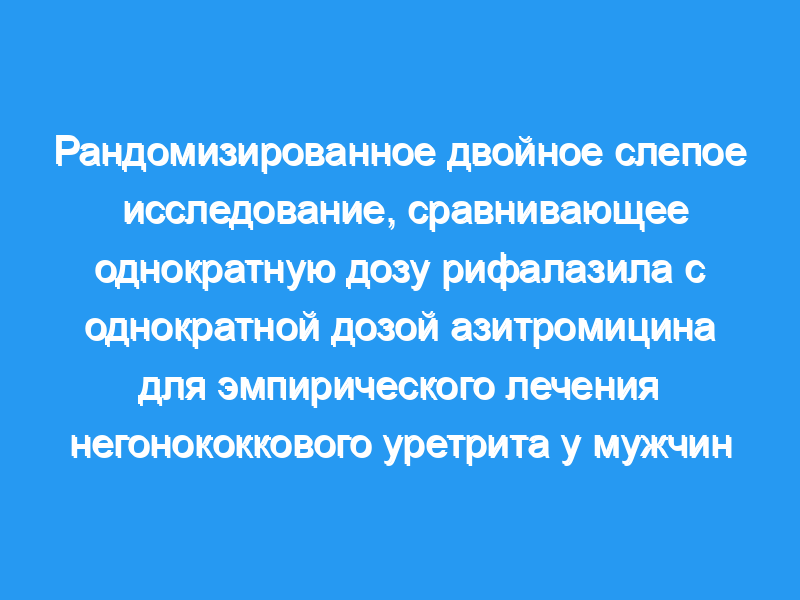 Определить безопасность и эффективность однократной дозы рифалазила, нового рифамицина, для лечения негонококкового уретрита (НГУ). Дизайн исследования: Рандомизированное двойное слепое исследование, сравнивающее рифалазил в дозе 2,5, 12,5 или 25 мг с 1,0 г азитромицина для лечения НГУ. Сто семьдесят мужчин были обследованы на наличие инфекции Chlamydia trachomatis, Ureaplasma urealyticum и Mycoplasma genitalium до начала терапии и через 2 и 5 недель после лечения.