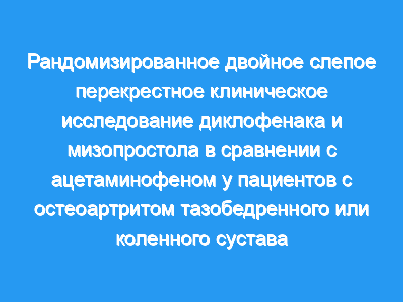 Пациенты в 12 амбулаторных учреждениях имели право на участие, если их возраст составлял >40 лет и если у них был рентгенологический остеоартрит коленного или тазобедренного сустава 2-4 степени Келлгрена/Лоуренса и оценка >, or =30 мм по 100-мм визуальной аналоговой шкале боли.. Пациенты были рандомизированы в одну из двух групп: 75 мг диклофенака + 200 мкг мизопростола два раза в день или 1000 мг ацетаминофена 4 раза в день (каждая в течение 6 недель), а затем были переведены на другое лечение в течение 6 недель. Плацебо было включено в каждую схему лечения, чтобы обеспечить двойное ослепление. Основными показателями результатов были Индекс остеоартрита университетов Западного Онтарио и Макмастера и визуальная аналоговая шкала боли Многоаспектного вопросника по оценке состояния здоровья. Безопасность оценивалась с использованием стандартной формы для анализа нежелательных явлений.
