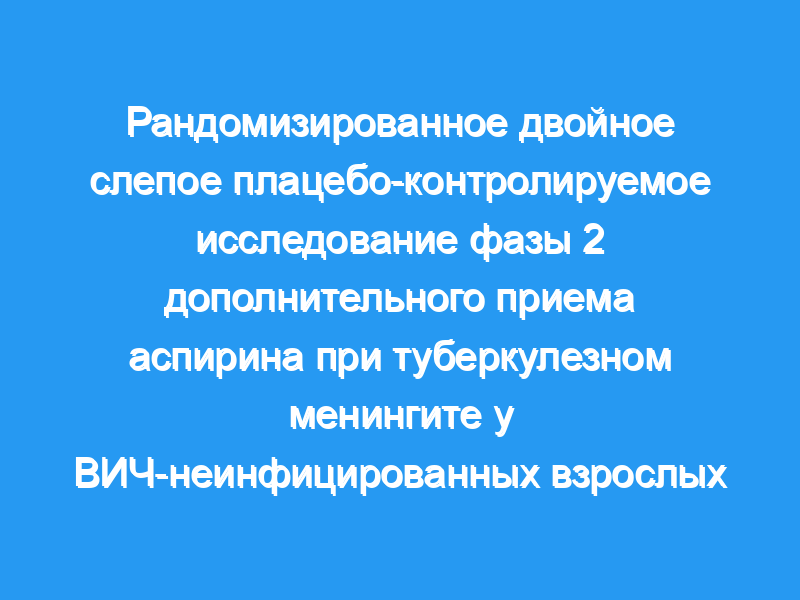 Мы провели рандомизированное контролируемое исследование на ВИЧ-неинфицированных взрослых с туберкулезом, ежедневно принимавших аспирин в дозе 81 мг или 1000 мг или плацебо в дополнение к противотуберкулезным препаратам и дексаметазону в течение первых 60 дней (NCT02237365). Первичной конечной точкой безопасности было желудочно-кишечное или мозговое кровотечение к 60 дням, первичной конечной точкой эффективности был новый инфаркт головного мозга, подтвержденный магнитно-резонансной томографией, или смерть к 60 дню.