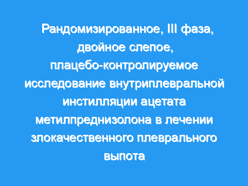 Цели исследования: Определить, улучшило ли внутриплевральное введение ацетата метилпреднизолона (МА) после терапевтического торацентеза при симптоматическом злокачественном плевральном выпоте время до повторного торацентеза для контроля симптомов, качества жизни (QOL) и одышки. Дизайн: Двойное слепое рандомизированное плацебо-контролируемое исследование.