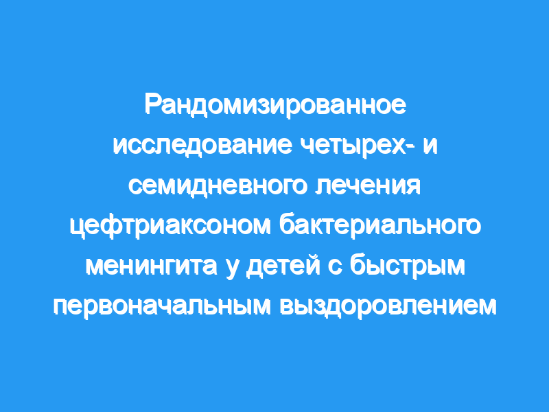 Семь или более дней противомикробного лечения являются стандартом для бактериального менингита, хотя цефалоспорины третьего поколения обычно способны стерилизовать спинномозговую жидкость в течение 24 часов. Ограниченный опыт применения более коротких схем у детей обнадеживает, и мы предположили, что у быстро выздоравливающих пациентов старше 3 месяцев это не будет представлять риска неблагоприятного исхода.