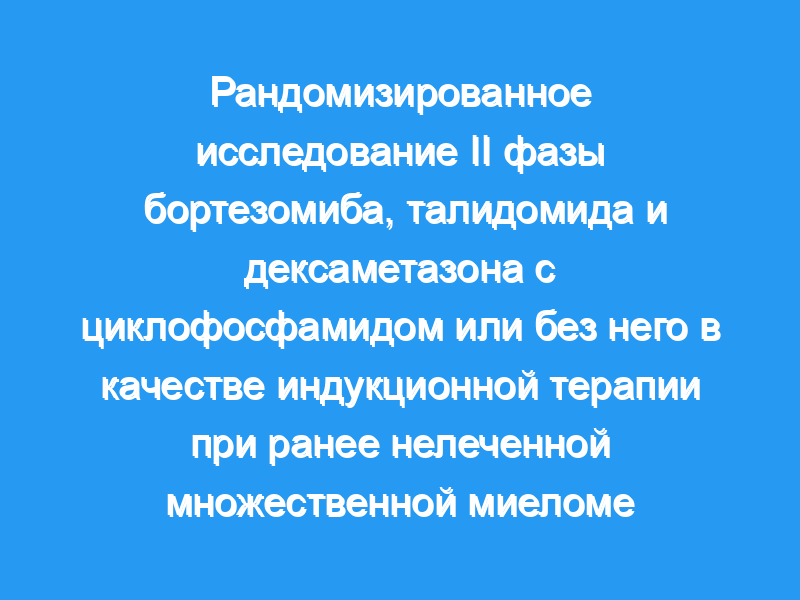 Бортезомиб-талидомид-дексаметазон (ВТД) является эффективной индукционной терапией при множественной миеломе (ММ). В этом несопоставимом исследовании II фазы была поставлена цель определить, может ли добавление циклофосфамида к этому режиму (VTDC) дополнительно повысить эффективность без ущерба для безопасности. Пациенты и методы: Пациенты в возрасте от 18 до 70 лет с ранее нелеченным, поддающимся измерению ММ, которые имели право на высокодозную химиотерапию -трансплантацию аутологичных стволовых клеток (HDCT-ASCT), были рандомизированы на бортезомиб 1,3 мг/м(2), талидомид 100 мг и дексаметазон 40 мг, с (n = 49) или без (n = 49) циклофосфамида 400 мг/м(2) в течение четырех 21-дневных циклов с последующей HDCT-ASCT. Первичной конечной точкой была постиндукционная комбинированная скорость почти полного ответа (nCR) или выше (включая полный ответ [CR] с нормализованным отношением свободной легкой цепи κ:λ в сыворотке, CR и nCR).