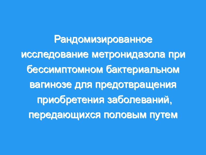 Целью этого исследования было определить, снижает ли лечение бактериального вагиноза (БВ) частоту заболеваний, передающихся половым путем (ЗППП). План исследования: Женщины с бессимптомным БВ были проспективно обследованы для определения эффекта лечения БВ для профилактики ЗППП. Женщины были случайным образом распределены для наблюдения или лечения и профилактики с помощью интравагинального геля метронидазола. Женщины ежемесячно проходили скрининг на ЗППП.