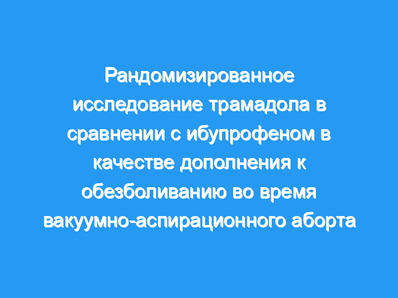 Исследование было проведено, чтобы определить, является ли трамадол более эффективным, чем ибупрофен, для уменьшения боли во время аспирации матки при аборте. Дизайн исследования: Женщины, обратившиеся в местную клинику для абортов, были приглашены принять участие в этом двойном слепом рандомизированном исследовании. После получения информированного согласия испытуемые были случайным образом распределены на прием 50 мг трамадола или 800 мг ибупрофена перорально в дополнение к стандартному клиническому протоколу обезболивания. Первичным результатом была боль, оцененная устно по шкале от 0 до 10. Измерения были получены сразу после и через 30 минут после обработки.