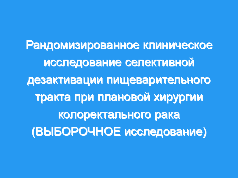 Эффективность SDD была оценена в ходе многоцентрового открытого РКИ в шести центрах в Нидерландах. Пациенты с колоректальным раком, которым была назначена плановая лечебная операция с первичным анастомозом, имели право на участие. Пациентам в группе СДД перорально вводили колистин, тобрамицин и амфотерицин В для обеззараживания пищеварительного тракта. Как в основной, так и в контрольной группе для периоперационной профилактики внутривенно вводили цефазолин и метронидазол. Была проведена механическая подготовка кишечника для левосторонних колэктомий, сигмовидной и передней резекций. Утечка анастомоза была первичным исходом, инфекционные осложнения и смертность были вторичными исходами.