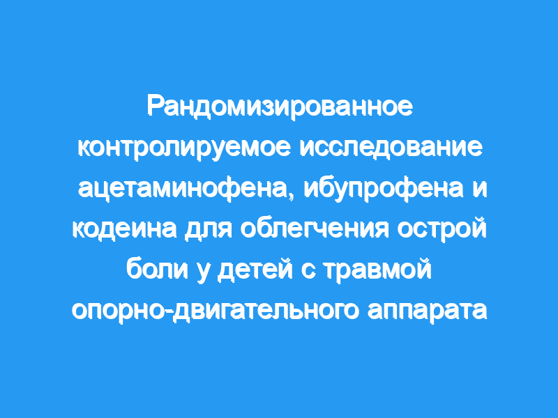 Наша цель состояла в том, чтобы определить, какой из 3 анальгетиков, ацетаминофен, ибупрофен или кодеин, вводимый в виде разовой дозы, обеспечивает наиболее эффективное обезболивание для детей, поступающих в отделение неотложной помощи с болью от острых травм опорно-двигательного аппарата. Пациенты и методы: Дети в возрасте от 6 до 17 лет с болью от травмы опорно-двигательного аппарата (конечностей, шеи и спины), возникшей за предыдущие 48 часов до поступления в отделение неотложной помощи, были случайным образом распределены для приема внутрь 15 мг/кг ацетаминофена, 10 мг/кг ибупрофена или 1 мг/кгкг кодеина. Дети, родители и ассистенты исследователей были слепы к групповому заданию. Первичным результатом было изменение боли от исходного уровня до 60 минут после лечения исследуемым препаратом, измеренное с помощью визуальной аналоговой шкалы.