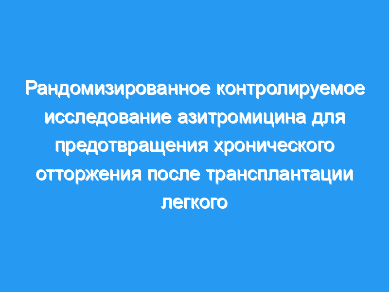 Азитромицин уменьшает воспаление дыхательных путей и улучшает объем форсированного выдоха за 1 с (ОФВ₁) при синдроме хронического отторжения или облитерирующего бронхиолита (БОС) после трансплантации легкого (LTx). Профилактика азитромицином может предотвратить БОС. Двойное слепое рандомизированное контролируемое исследование азитромицина (n = 40) или плацебо (n = 43), начатое при выписке и вводимое три раза в неделю в течение 2 лет, было проведено в 2005-2009 годах в Университетской больнице Левена (Левен, Бельгия). Первичными конечными точками были отсутствие БОС и общая выживаемость через 2 года после ЛТХ, вторичными конечными точками были острое отторжение, частота лимфоцитарного бронхиолита и пневмонита, распространенность псевдомональной колонизации дыхательных путей или желудочно-пищеводного рефлюкса, а также изменение ОФВ₁, дыхательных путей и системного воспаления с течением времени.