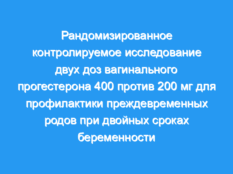 Это проспективное однослепое рандомизированное контролируемое исследование, проведенное на 100 первородящих, у которых была двойная беременность и которые посещали женскую консультацию университетской больницы. Они были равномерно и случайным образом распределены на две группы, каждая из которых содержала по 50 пациентов. Группа 1 получала 400 мг, а группа 2 получала 200 мг вагинального прогестерона ежедневно перед сном, начиная с 14 недель беременности до 36 недель. Трансвагинальное ультразвуковое исследование было проведено для оценки длины шейки матки на 14 и 22 неделях.