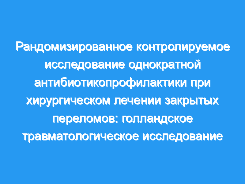 Эффективность профилактических антибиотиков в хирургии переломов остается спорной из-за отсутствия хорошо документированных проспективных исследований. Здесь мы сообщаем о результатах Голландского травматологического исследования, проспективного рандомизированного двойного слепого плацебо-контролируемого исследования антибиотикопрофилактики при первичном оперативном лечении переломов конечностей. Цефтриаксон был выбран из-за его фармакокинетического профиля, включая высокие уровни в сыворотке крови, высокое проникновение в ткани и длительный период полувыведения, что делает его подходящим для однократной профилактики.