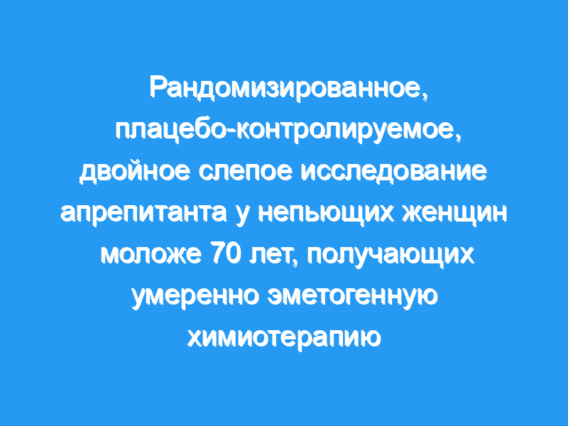 Непьющим женщинам <,70 лет, проходящим МЕК, случайным образом назначали апрепитант (1-й день, 125 мг, 2-й и 3-й дни, 80 мг) или плацебо. Дексаметазон на 1-3-й день составлял 12, 4 и 4 мг с апрепитантом и 20, 8 и 8 мг с плацебо. Первичной конечной точкой был полный ответ (CR, отсутствие рвоты или спасательной терапии) в течение 120 ч первого цикла. Логистический регрессионный анализ был проведен для выявления предикторов общего CR.