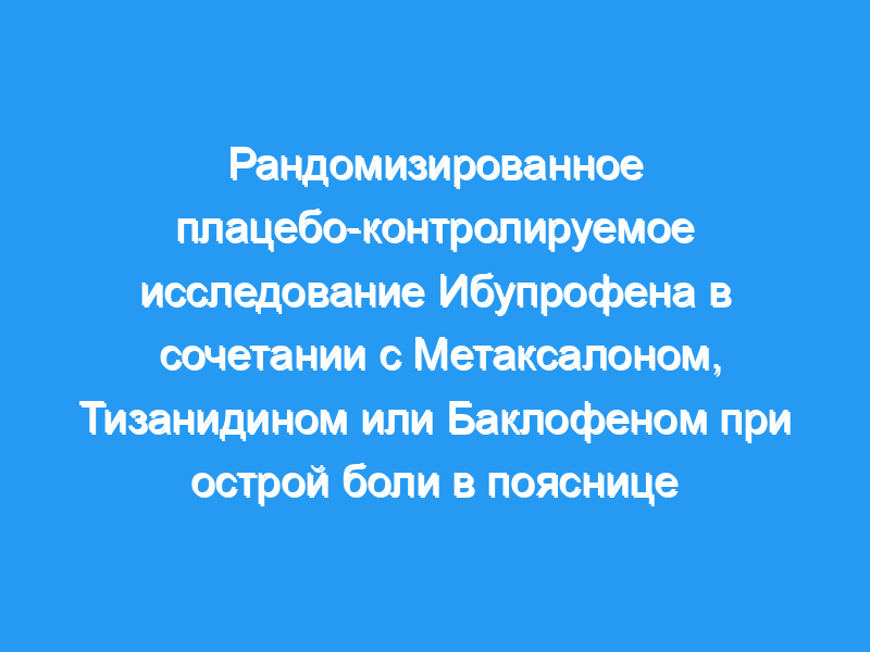 Пациентов с болями в пояснице часто лечат нестероидными противовоспалительными препаратами и миорелаксантами. Мы сравниваем функциональные исходы и боль у пациентов с острой болью в пояснице, которые были рандомизированы на 1-недельный курс ибупрофена плюс плацебо, по сравнению с ибупрофеном плюс 1 из 3 миорелаксантов: баклофен, метаксалон и тизанидин.