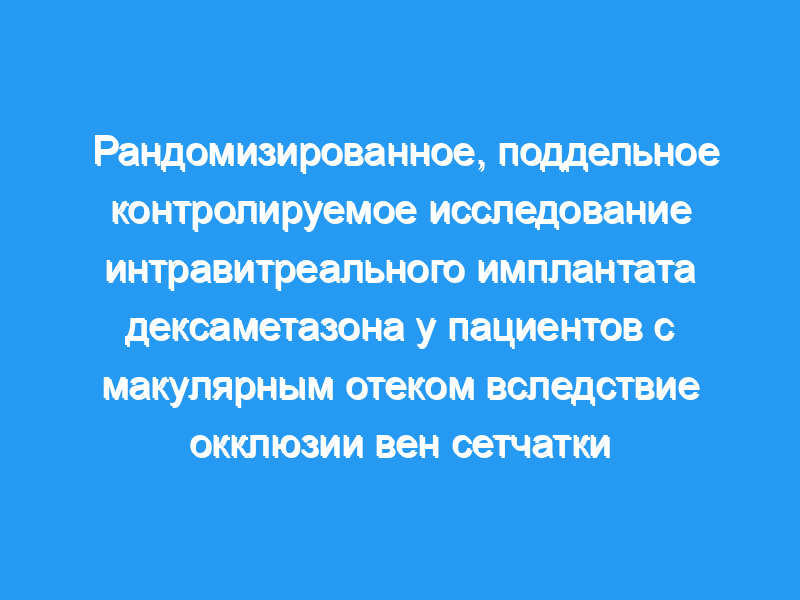 Оценить безопасность и эффективность интравитреального имплантата дексаметазона (DEX implant, OZURDEX, Allergan, Inc., Ирвин, Калифорния) по сравнению с фиктивным в глазах с потерей зрения из-за макулярного отека (ME), связанного с окклюзией ветвей вен сетчатки (BRVO) или окклюзией центральной вены сетчатки (CRVO).. Дизайн: Два идентичных, многоцентровых, замаскированных, рандомизированных, 6-месячных, фиктивно контролируемых клинических исследования (каждое из которых включало пациентов с BRVO и пациентов с CRVO). Участники: в общей сложности 1267 пациентов с потерей зрения из-за ME, связанной с BRVO или CRVO. Вмешательство: Однократное лечение имплантатом DEX в дозе 0,7 мг (n = 427), имплантатом DEX в дозе 0,35 мг (n = 414) или фиктивным имплантатом (n = 426). Основные итоговые показатели: Основным показателем результата для объединенных данных из 2 исследований было время достижения >, или =15-буквенное улучшение остроты зрения с наилучшей коррекцией (BCVA). Вторичные конечные точки включали BCVA, центральную толщину сетчатки и безопасность.