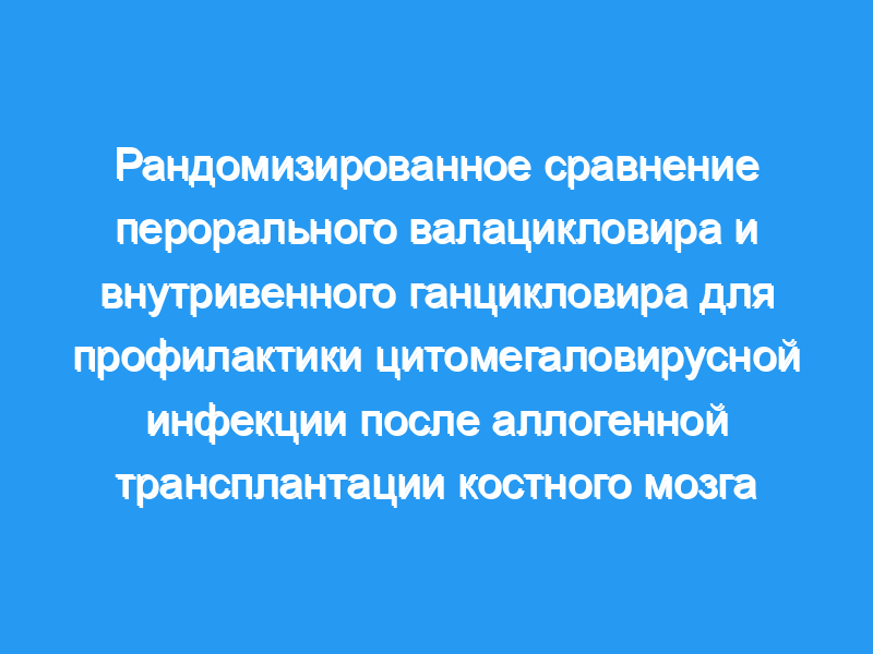 ЦМВ-инфекция произошла у 12% пациентов, получавших валацикловир, и у 19% пациентов, получавших ганцикловир (отношение рисков [ОР] 1,042, 95% доверительный интервал [ДИ] 0,391-2,778, Р= 0,934). Заболевание ЦМВ развилось только у 2 пациентов, получавших валацикловир, и у 1 пациента, получавшего ганцикловир (ОР 1,943, 95% ДИ 0,176-21,44, Р=0,588). Пероральный валацикловир может быть эффективной альтернативой внутривенному введению ганцикловира для профилактики ЦМВ-инфекции после трансплантации костного мозга.
