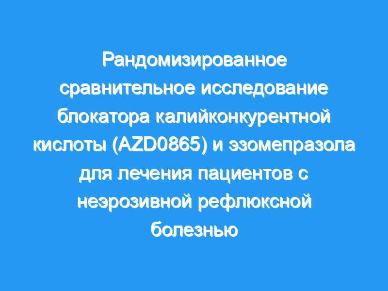 AZD0865 — это средство, подавляющее желудочную кислоту, которое обладает быстрым началом действия и длительной продолжительностью эффекта. В этом двойном слепом рандомизированном многоцентровом исследовании изучалась эффективность и безопасность AZD0865 при лечении пациентов с неэрозивной рефлюксной болезнью (NERD).
