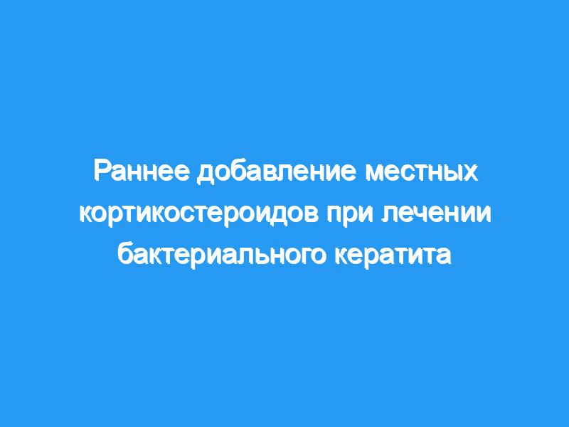 Чтобы определить, полезны ли местные кортикостероиды в качестве дополнительной терапии бактериального кератита, если они назначаются на ранних стадиях течения инфекции. Дизайн, условия и участники: Исследование «Стероиды при язвах роговицы» (SCUT) было рандомизированным плацебо-контролируемым исследованием с двойной маскировкой, которое в целом не выявило эффекта от добавления местных кортикостероидов к местному моксифлоксацину гидрохлориду при бактериальном кератите. Здесь мы оцениваем сроки введения кортикостероидов в подгрупповом анализе SCUT. Мы определяем более раннее введение кортикостероидов (по сравнению с плацебо) как добавление после 2-3 дней местных антибиотиков, а позднее как добавление после 4 или более дней местных антибиотиков. Основные результаты и меры: Мы оцениваем влияние местных кортикостероидов (по сравнению с плацебо) на 3-месячную лучшую остроту зрения с коррекцией очковой коррекции у пациентов, которые получали кортикостероиды или плацебо раньше, чем позже. Дальнейшие анализы были проведены для подгрупп пациентов с кератитом, не связанным с нокардией, и пациентов, не применявших местные антибиотики до зачисления.
