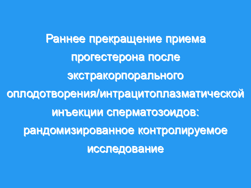Изучить влияние прекращения поддержки прогестероном (P) на 5-й неделе по сравнению с 8-й неделей на частоту продолжающейся беременности после экстракорпорального оплодотворения (ЭКО)/интрацитоплазматической инъекции сперматозоидов (ИКСИ). Дизайн: Проспективное, рандомизированное, контролируемое исследование.