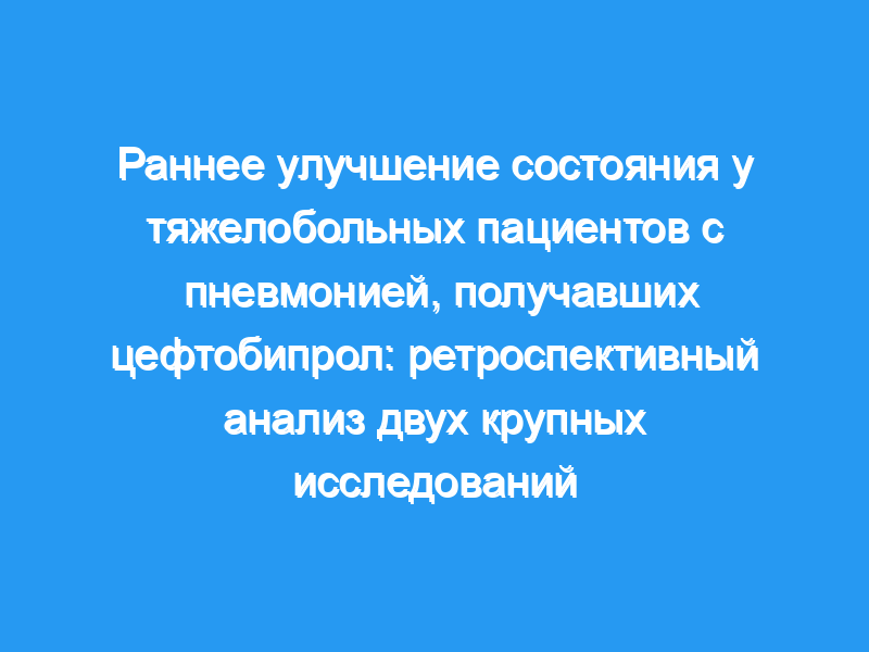 Предыдущие исследования показать, что цефтобипрол является эффективной терапией для пациентов с пневмонией, которые подвергаются высокому риску неблагоприятных исходов. Этот анализ post hoc предоставляет предварительные доказательства того, что лечение цефтобипролом может иметь преимущества перед другими антибиотиками с точки зрения достижения раннего улучшения у пациентов с ГАП высокого риска (исключая ВАП) и в некоторых подгруппах пациентов с ВП высокого риска. Пробная регистрация: NCT00210964 : зарегистрирован 21 сентября 2005 года, NCT00229008 : зарегистрирован 29 сентября 2005 года, NCT00326287 : зарегистрирован 16 мая 2006 года.