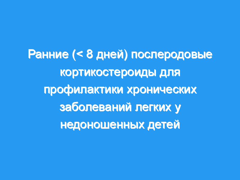 Определить, помогает ли послеродовое лечение кортикостероидами в профилактике хронических заболеваний легких (ХБП) у недоношенных детей. В этом обзоре рассматриваются результаты исследований, в которых недоношенным детям с риском развития ХЛЛ давали послеродовые кортикостероиды в течение первых семи дней жизни. Стратегия поиска: Рандомизированные контролируемые исследования (РКИ) послеродовой терапии кортикостероидами были запрошены из Cochrane Controlled Trials Register, MEDLINE (1966 — май 2008), путем ручного поиска в педиатрических и перинатальных журналах, изучения предыдущих обзорных статей и информации, полученной от практикующих неонатологов. С авторами всех исследований связывались, где это было возможно, для подтверждения деталей зарегистрированных последующих исследований или для получения любой информации о долгосрочном последующем наблюдении, о котором не сообщалось. Критерии отбора: Для этого обзора были отобраны рандомизированные контролируемые исследования послеродового лечения кортикостероидами в течение первых 7 дней жизни (на ранних сроках) у недоношенных детей высокого риска. В большинстве исследований оценивалось применение дексаметазона, но мы также включили исследования, в которых оценивался гидрокортизон, даже если он использовался для лечения гипотензии. Сбор и анализ данных: Данные о клинических исходах, включая смертность, CLD (включая позднюю помощь кортикостероидами и необходимость домашней кислородной терапии), смерть или CLD, невозможность экстубации, осложнения во время первичной госпитализации (включая инфекцию, гипергликемию, гипертензию, утечку воздуха из легких, открытый артериальный проток (PDA), тяжелое внутрижелудочковое кровоизлияние (IVH), перивентрикулярная лейкомаляция (PVL), некротизирующий энтероколит (NEC), желудочно-кишечное кровотечение, перфорация кишечника, тяжелая ретинопатия недоношенных (ROP) и отдаленные исходы (включая слепоту, глухоту, церебральный паралич и серьезные нейросенсорные нарушения) были отобраны и проанализированы с использованием RevMan 5.