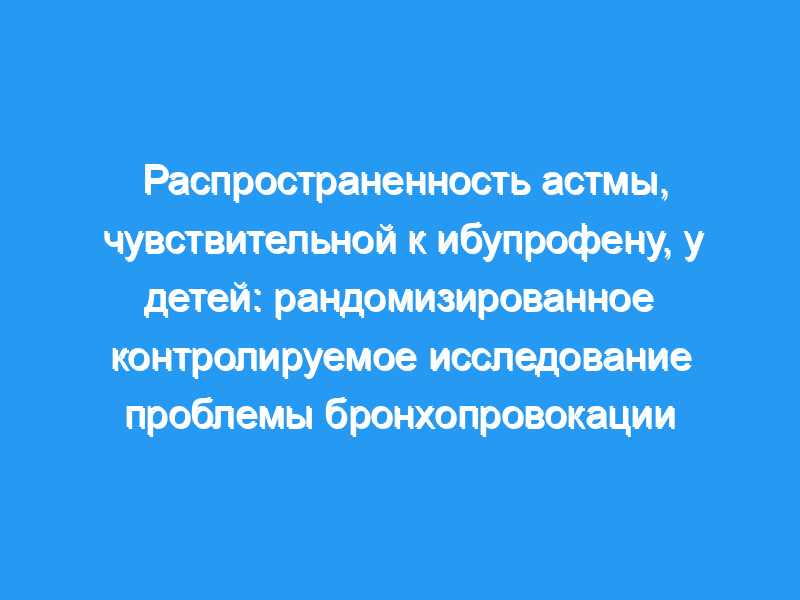 Определить распространенность астмы, чувствительной к ибупрофену, у детей школьного возраста с легкой или умеренной персистирующей астмой. План исследования: Рандомизированное, двойное слепое, плацебо-контролируемое перекрестное исследование проблемы бронхопровокации у детей в возрасте от 6 до 18 лет с легкой или умеренной персистирующей астмой. Пациенты получали однократную дозу ибупрофена или плацебо в соответствии с рандомизацией, а затем возвращались через 2-7 дней для повторения процедур после приема исследуемого препарата, не полученного при первом посещении. При каждом посещении пациентам проводили спирометрию до и (1/2), 1, 2 и 4 часа после введения исследуемого препарата. Мы определили бронхоспазм как снижение объема форсированного выдоха в первую секунду (ОФВ1) на 20% от исходного уровня, а чувствительность к ибупрофену — как бронхоспазм после приема ибупрофена, но не плацебо.